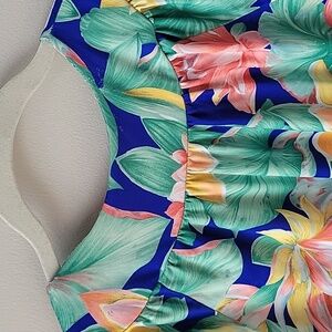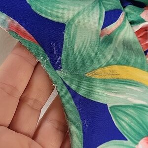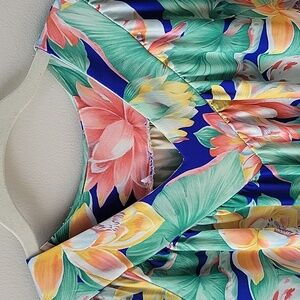 Pre-owned, this vibrant floral midi dress/ cover-up with short sleeves is in good condition, some tiny flaws noted in photos. The size & care tag have been cut out. By measurments, I would say it would be a size small, and the fabric feels like polyester. Features a mix of green, blue, pink, and yellow colors.