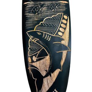 The carved surfboard with the shark, sailboat, and sunset scene gives off serious island vibeslike a little slice of Maui right in your home. Its not just decor; its storytelling. The shark adds drama, the sailboat suggests adventure, and the palm trees with the setting sun bring in that laid-back tropical calm. Hand carved in Hawaii.