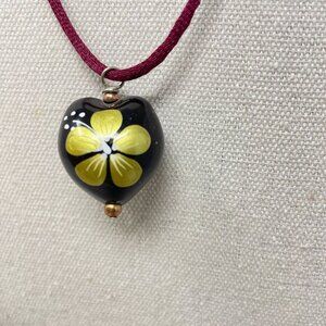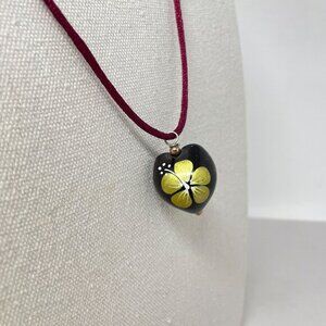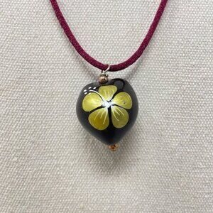 Hawaiian Kukai Nut Necklace Handpainted Black Floral Adjustable