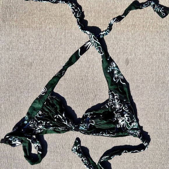 Pakarang brand, no size but around a small. The tag does not say material but it feels like cotton. It is dark green with a flower/Hawaiian pattern. It ties on the top and sides with an open back.