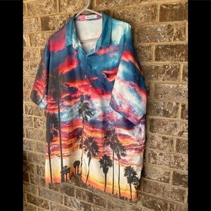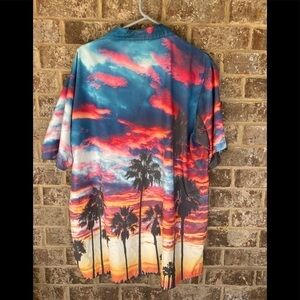 Hawaiian pink sunset palm trees button down shirt size large. Gently preowned condition. Armpit to armpit Measures 21”. Shoulder to hemline measures 30”.