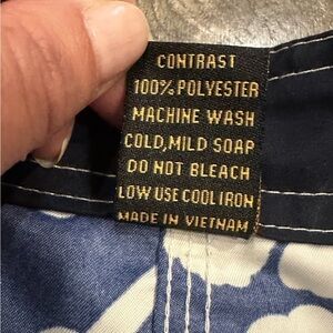 • Features: Microfiber fabric in a bright dark blue and white colorway with hibiscus flowers, guitars and geckos. Cargo pocket on side. Unlined.