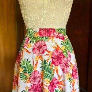 Bright flowy swing skirt in a fun tropical Hawaiian pattern. Hibiscus flower and palm leaf print in vibrant pink, orange, and green, on a white background.