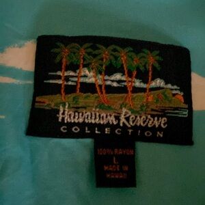Hawaiian Reserve Collection Aloha Shirt Mens L woody cars surfboards Palms Beach