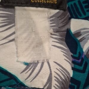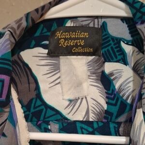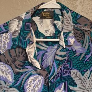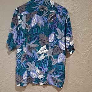 Vibrant shirt with a bold leaf pattern. Features shades of teal, purple, and gray.