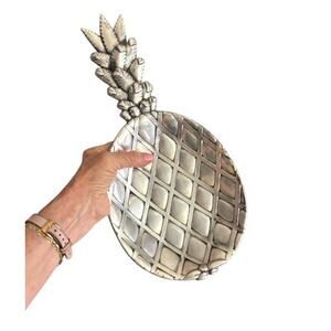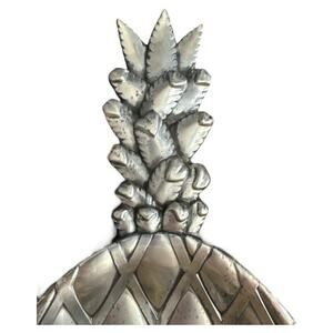 Excellent preowned condition. This is a heavy aluminum tray created by a company named.Hawaiian Treasures in Japan. The aluminum is antique looking and is carved in the shape of a pineapple. At the top is the beautiful crown of leaves and at the base are a few more leaves. Underneath our 4 feet to hold the tray steady. This would look good in a tropical setting, of course, but also in any decor where you would like something unique and beautiful. Measurements are approximate but are as close as possible. Overall length of the tray is 14 inches. Leaves at the top measure 5 1/2 inches and the pineapple part itself measures 8 1/2 inches. The pineapple is about 7 inches wide and it stands one and a half inches off the ground