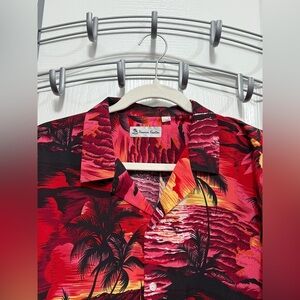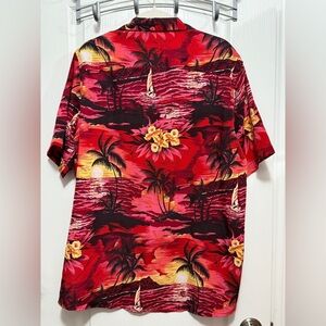 Hawaiian vacation button down Shirt mens L blouse red sunset Hawaii island beach