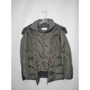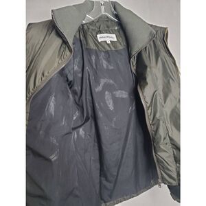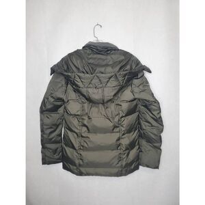 Nicely designed piece to keep you warm and cozy during the winter, featuring cuffed sleeves and inner collar to keep out the cold. Item is in overall good condition with very minor snags on back shown in photo. There is also a hole in the inner lining of the right front pocket but it could be repaired if desired. Coat is a dark olive brown color.