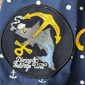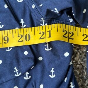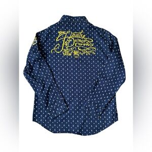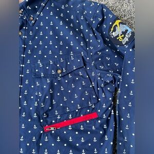 H. & Dumar men’s like new navy blue anchor patterned collared dress shirt. Front pockets, embroidery, patches and back logo.