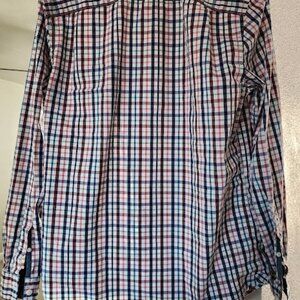 This is a large men's button down from Hawker Rye. It is a slim fit shirt with red and blue accents. It has a hidden embroidery on the inside with white buttons down the shirt and on the sleeves. This has never been worn and does not have any distressing.