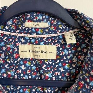 This floral short sleeve button up is perfect for spring! Navy with colored spots, this goes well with a variety of outfits. It is sized as an XL Tall Slim fit.