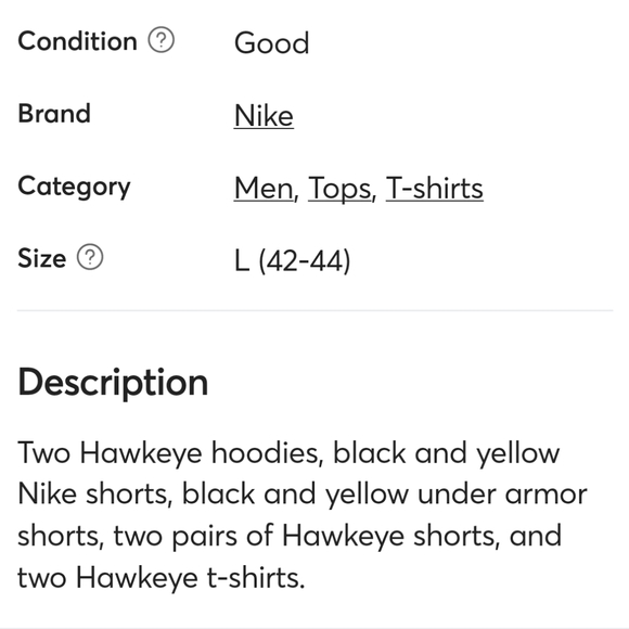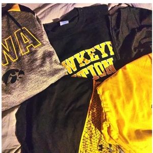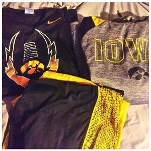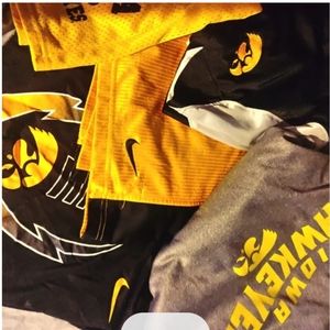 Two Hawkeye hoodies, black and yellow Nike shorts, black and yellow under armor shorts, two pairs of Hawkeye shorts, and two Hawkeye t-shirts. size Large
