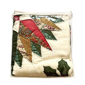 The Hawthorne Hill hand-quilted Christmas quilt / decorative hanging is a festive and charming addition to your holiday decor. Made with 100% cotton shell and 100% polyester fill. Featuring a traditional patchwork design with hand stitching and piecing. Multicolored, intricate details with quilted, embroidered, and appliquéd elements. There is a sewn sleeve on the backside to hang the quilt. A unique, handmade piece to add some charm and cozy warmth to your Christmas celebrations.