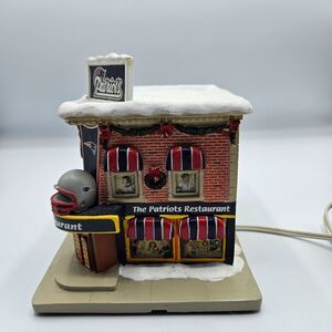 Authentic collectible from the Hawthorne Village New England Patriots Christmas Village series. The Patriots Restaurant is a hand-painted, illuminated porcelain building featuring the teams signature red, white, and blue awnings, a snow-covered roof, and festive wreath accents. A charming addition for any New England Patriots fan or collector of sports-themed Christmas villages.