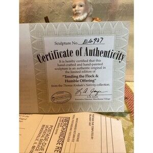 The Hawthorne Village Tending The Flock & Humble Offering Kinkade Nativity 2002 is a collectible Nativity scene set featuring pieces from the Thomas Kinkade franchise. Made of porcelain and handcrafted in the United States, this set includes the Humble Offering and Tending The Flock pieces, showcasing a religious Christmas theme. Packaged in its original vintage packaging, this set is designed for adult collectors and would make a meaningful addition to any Christmas decor collection.