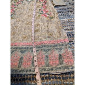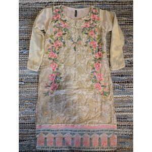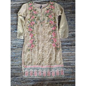 Hayat Embroidered Beige Pink Green Floral Kurti Dress S/M Ethereal Special Occasion
