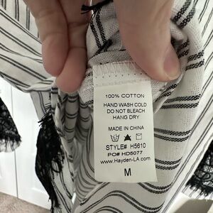 Chic blouse with black stripes and lace accents. Stylish and versatile.