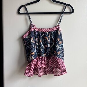 Elegant floral camisole with a navy base and pink accents. Features a ruffled hem and adjustable straps.