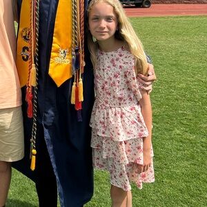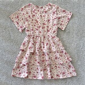 Hayden Girls Floral Pink Dress. Charming floral pink dress perfect for any occasion. Features a delightful layered design for added style. Button closure at the back of the neck. Short sleeves. 100% polyester. Size M. Excellent condition.