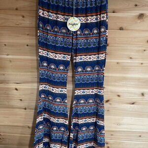 Blue and white boho flare pants with a unique pattern #festivalvibes