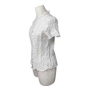A timeless blouse that will never go out of style.Functional Buttons All The Way Down. Short Sleeve With Ruffle Detail. Lace Detailing On Bodice. Lace Trimmed Collar. Lightweight & Sheer Fabric. High-Low Hem. 100%  Cotton . Relaxed Fit. Color: white