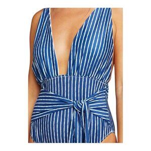 Hayden Los Angeles Bathing Suit Vertical Blue White Stripes Deep V Plus Size 3XL