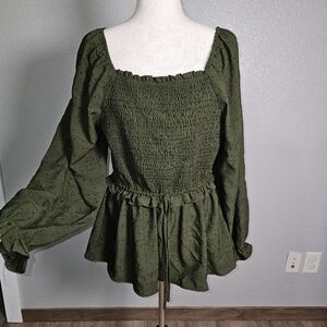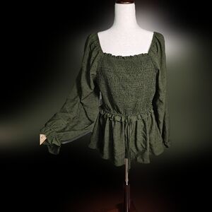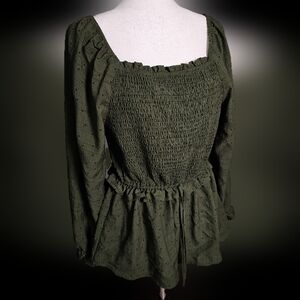 Hayden Los Angeles Smocked Green Textured Blouse Top Square Neck Elastic Waist L