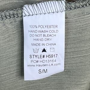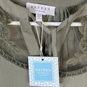 Hayden Sheer Tie Front Peasant Top. Style# H5917. Size S/M. Color ~ Olive. Front lined sheer. Sheer mesh lace bib neckline front with self-tie closure. Elastic peasant sleeve. Sheer back. Flowing silhouette. New with tags. Measurements are in the pictures.