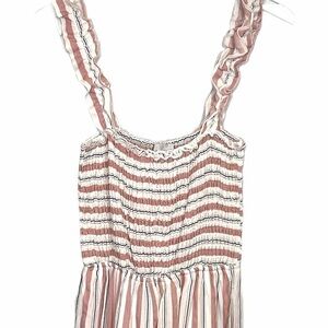 Hayden Los Angeles pink and white striped jumpsuit. Smocked bodice and ruffled straps with elastic. Jumpsuit is lined down to about mid-thigh, with pocket. The blue jumpsuit shown in photo #5 is the same jumpsuit in different colors, but is for comparison only. The jumpsuit for sale here is pink/white/and navy. Jumpsuit has wide legs and is stretchy. NWT. Size M.