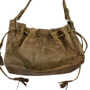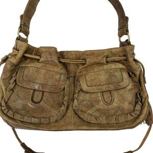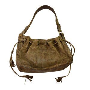 Adorable, relaxed leather hobo bag that has an adjustable top closure, chunky strap and some ruffle detail at the strap and around the front pockets. Front pockets are a magnetic flap closure. The inside lining has a colorful print. One zip closure pocket on the inside and other open pockets. The color is like a greenish-gold.