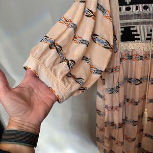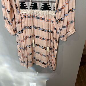 Gorgeous Mexican embroidered details adorn this breezy dress. Soft pink sand tones pair with a Mexican printed body, 3/4 sleeves, a soft draped fit, and a tassel tie neck.