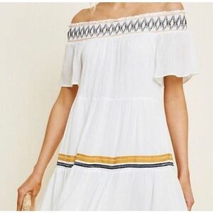 Hayden Los Angeles OFF-SHOULDER TIERED Boho White SWING-DRESS L NWT. Off white tiered dress, featuring an off shoulder smocked, elastic, neckline, short sleeves and a flowing silhouette. Lightweight crinkled gauze fabric. This cute mini dress is fully lined and not sheer. Perfect resort beach dress!
