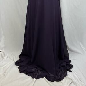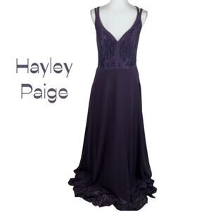 Hayley Paige Sheer Eggplant Purple Evening Party Dance Maxi Dress NWOT Size 12