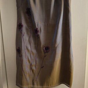 Hayley Rose women's gray/blue iridescent sleeveless dress with V back and back zipper is perfect for any occasion. Its sleek design and subtle floral accents add a touch of sophistication. Ideal for both casual and formal events. Size 4. pit to pit measures 16 inches. Length 32 inches.