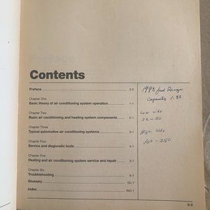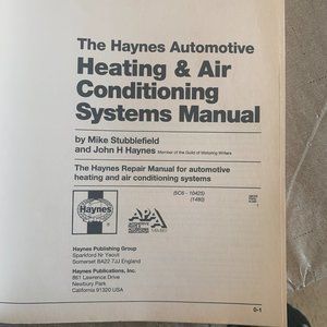 This listing is for a preowned, softcover repair manual, Haynes Techbook Automotive Heating & Air Conditioning, system maintenance, Troubleshooting, Repair & Specifications. The page edges have some discoloration but it appears to be tightly bound and pages are in good condition. This is a shop used book and does have box cutter damage to back side & some pages. All of my items come from a smoke-free home but I will mention, for allergy purposes, that I have pets.