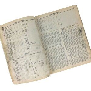 Book is well used and in rough shape - has grease stains, wrinkling, creases, yellowed pages and moisture damage along one side.