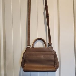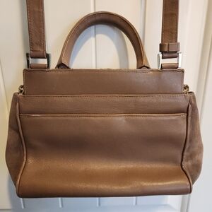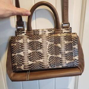 Beautiful Hayward python brown crossbody bag. This purse is so stylish. With a crossbody, adjustable strap, and a handle, you can wear it anywhere. The Python leather flap also has a conveniently hidden zipper pocket. There is also a pocket on the back of the purse, as well as a larger interior pocket with an additional smaller zip-up pocket. This purse has been used but is in very good condition. There are some spots on the interior where the color of the leather has been changed after cleaning up a small spill. The leather is otherwise not affected. The only wear on the exterior is the suede sides that have visible signs of wear, as shown in pictures. There are no rips. This ourse is from her 2015 collection.