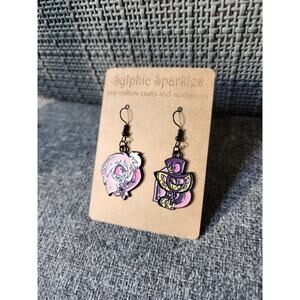 Cute metal and enamel charm earrings featuring Cherri Bomb and Sir Pentious from Hazbin Hotel. Hypoallergenic hooks in matching black.