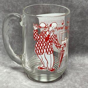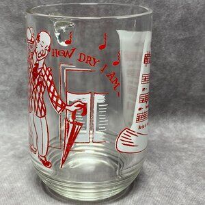 Vintage Hazel Atlas Big Top Peanut Butter Glass "How Dry I Am" Song Lyrics Mug. Clear glass with red print, holds 16 ounces. Ideal for collectors or those who appreciate nostalgic kitchenware.