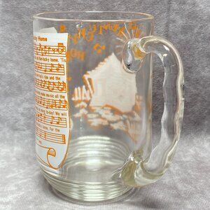 Vintage Hazel Atlas Big Top Peanut Butter Glass "My Old Kentucky Home" Song Lyrics Mug. Clear glass with orange print, holds 16 ounces. Ideal for collectors or those who appreciate nostalgic kitchenware.
