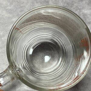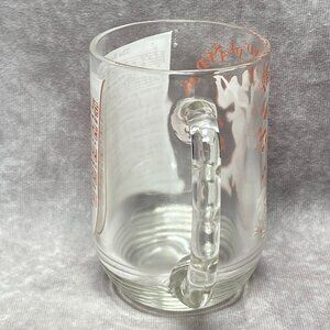 Vintage Hazel Atlas Big Top Peanut Butter Glass "The Band Played On" Song Lyrics Mug. Clear glass with orange print, holds 16 ounces. Ideal for collectors or those who appreciate nostalgic kitchenware.