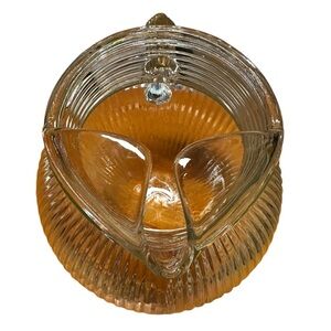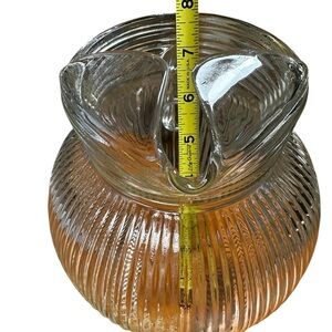 The Hazel Atlas Clear Ribbed TILT BALL Depression Glass Tilted Handled Pitcher is a vintage Art Deco style pitcher from 1940. Made of glossy clear glass with a ribbed pattern, this round pitcher is an antique American piece that exudes charm and elegance. It features a tilted handle for easy pouring and a unique tilt ball design, adding a touch of nostalgia to any collection. Hand wash only, this original studio crafted pitcher by Hazel-Atlas is a timeless addition to any home decor.