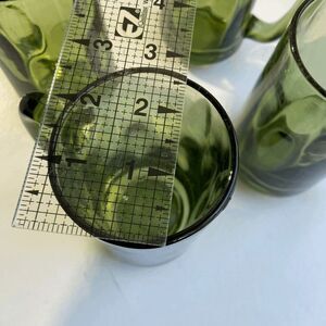 This vintage Hazel Atlas Lyric Drop Dot Optic Avocado Green Glass Mug Set of 4 is a stunning mid-century find. The mugs feature a unique optic drop dot pattern, adding texture and visual interest. Made of heavy, durable glass, these steins are perfect for any retro-inspired kitchen or bar setup. They stand approximately 6.5" tall, with a diameter of about 2.75", and their vibrant green hue reflects the iconic style of the 1960s to 1970s. These sturdy mugs are ideal for both display and functional use.