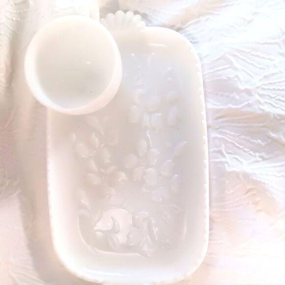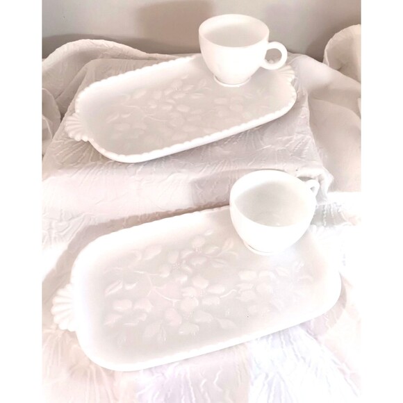 Hazel Atlas Milk Glass Dogwood Pattern Snack Tray with Cup Set Of 2