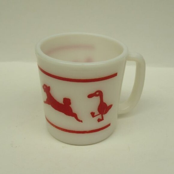 This is a really nice milk white glass with red Farm Animals childs handled mug made by Hazel Atlas Glass. This mug features a pig, lamb and duck. The mug measures 3 1/8 inches high X 3 inches in diameter across the top. The mug is in very good condition with no chips or cracks. The Farm Animals decoration is very good. Be sure to search our other vintage mugs available.