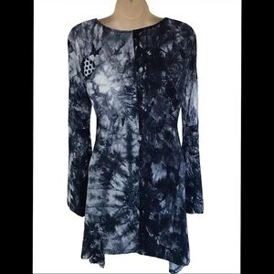 Hazel blue tie dye lace up front shark bite hem tunic top. Top has flowy bell sleeves and is made of a soft rayon spandex blend. Top is a woman's size medium.