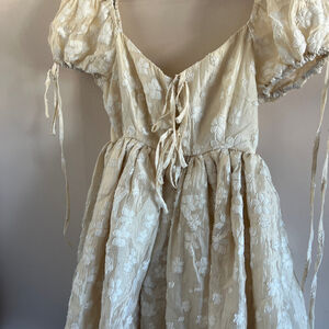 Mini dress with puff sleeves and floral embroidery. Ties at the waist. polyester.