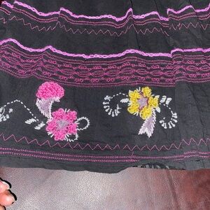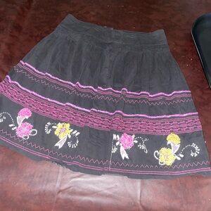 How cute is this knee length skirt from Anthropologie?! All cotton with an under skirt and hand sewn beads and yarn. Half zip and 2 button side closure. At far view I thought they were poodles but I actually think they’re flowers and there’s stars in the center of the yarn circles. There’s a couple flaws as shown in the photos. One in the top pink stitch detail and the other in the beading detail. Otherwise super adorable and definitely a statement piece!