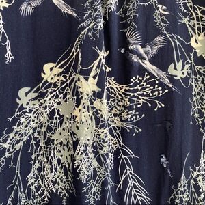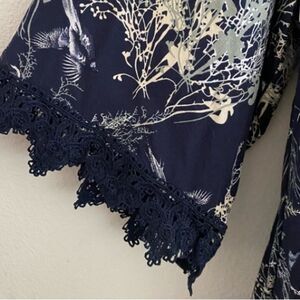 Hazel Lace Trim Boho Chic Bird Print Blouse Top Blue hi-lo hem Women’s Medium