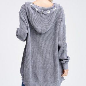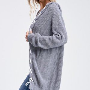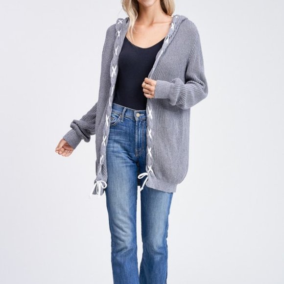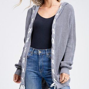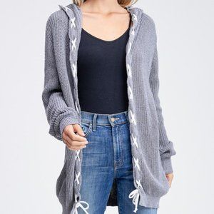 Hazel Laced Detail Sweater Cardigan with Hoodie Laced detail around open front cardigan and hoodie